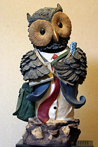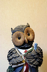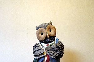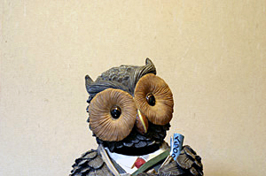 | ■デジタルカメラに限らないのですが、上の写真構図はいわゆる日の丸写真の構図です。私自身、慌ててピント合わせて撮るときに、今でもよくみごとな日の丸写真になります。デジタルカメラで撮影した画像はパソコンで構図さえも修正できますのでいいじゃないかとも思いますが、できれば避けたい構図です。 ここでは、人物のモデルがいなくて「ふくろうの置物」をモデルにしてみました。 |