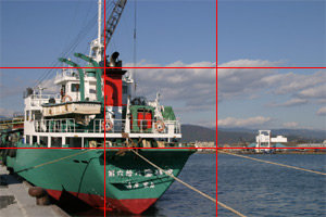 | 上左の写真に赤い線で画面を3分割みました。主題を3分割した交差点に配置すると構図的にバランスが決まります。なるほどと思って心がけてはいますが、いざ慌てて撮影すると、シャタースピードや露出、ホワイトバランス、ISO感度と確認しているうちに見事な日の丸写真になることは私自身何度も経験します。プロカメラマンやハイレベルなアマチュアカメラマンの上手な写真はたいへん参考になります。 | |
